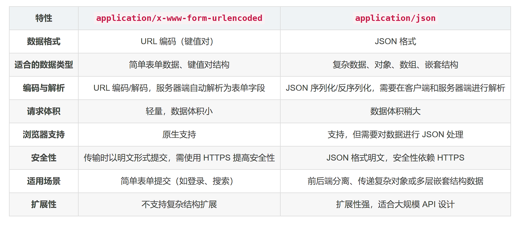数据格式:将表单数据以键值对的形式编码成 URL 查询参数的格式,数据在请求体中以 key=value 的形式传递,并且键和值通过 & 连接。特殊字符会使用 URL 编码(例如,空格编码为 %20)。